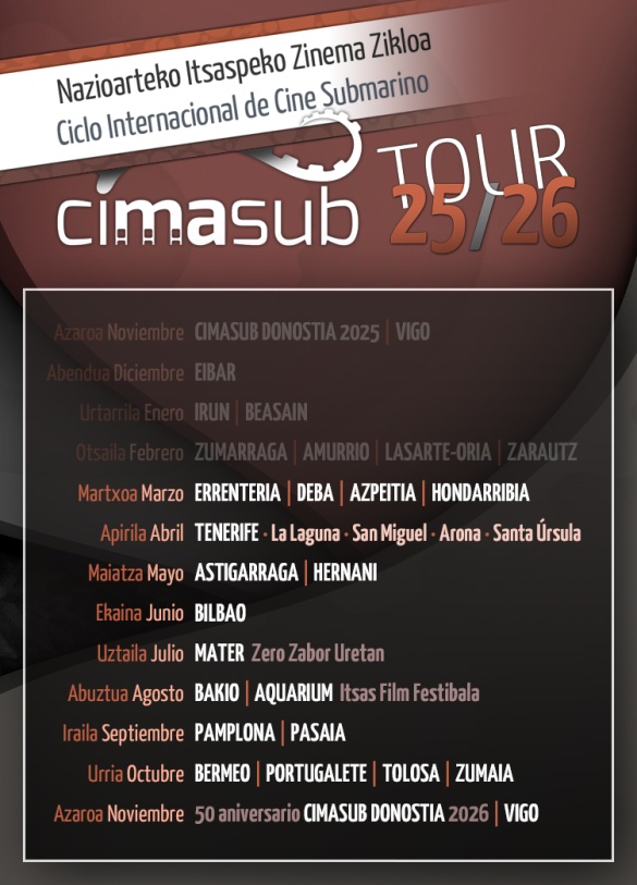 DONOSTIA · CIMASUB 2025 > Zinema: 13+14+15 (19:00 Antzoki Zaharra). Txikiziklo: 10/14 (Aquarium auditoriuma). Erakusketa: 1/28 (Nautilus Aretoa Aquariuma, Garbera, Anoetako Kirol Etxea).